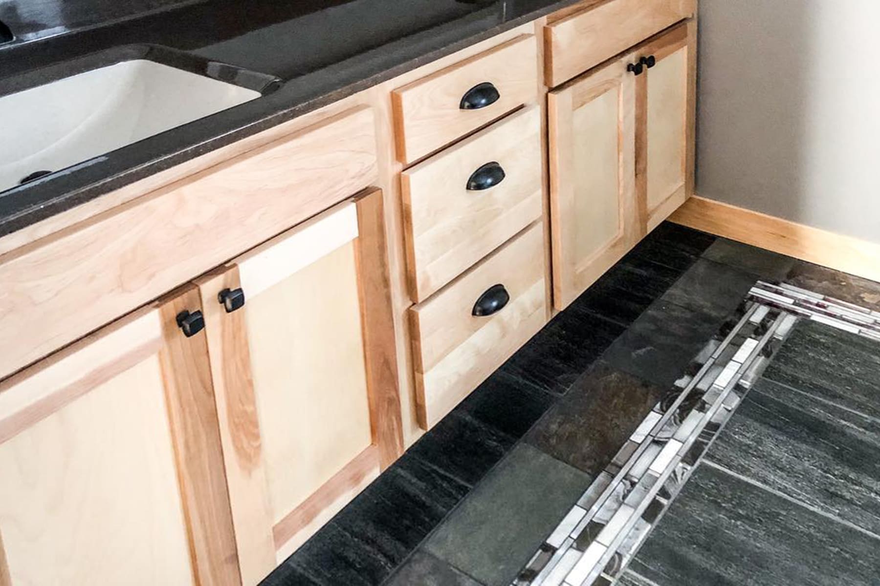 Birch is a smooth, even grained hardwood that is predominantly off-white with some brown variation giving it a calico appearance. Birch cabinets with a wiping stain, or in a natural finish will not be consistent in color. The ends of the stiles and the cross grain profile in the raised panel will be much darker than the rest of the door. In addition, the face frame, doors, and drawer fronts can be different colors. This is not considered a defect but desired by those wanting a “rustic” look.